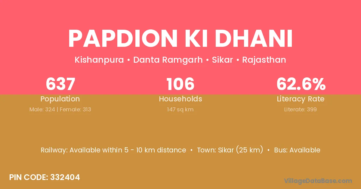 Sikar (25 km) is the nearest town to Papdion Ki Dhani village for major economic activities and is located approximately 25 km away.