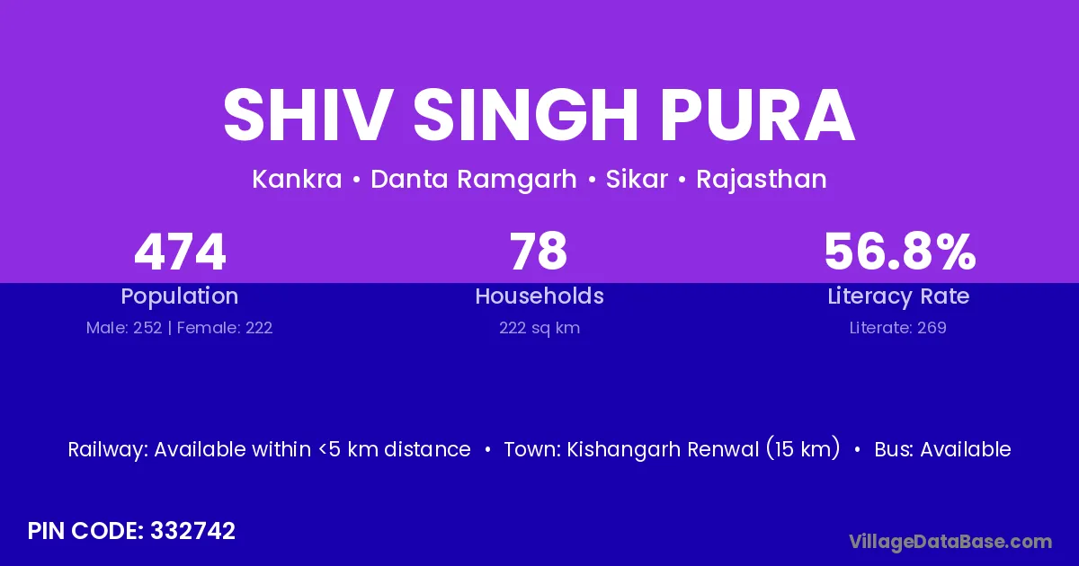 Shiv Singh Pura village has a total population of 474 people, of which 252 are males and 222 are females.