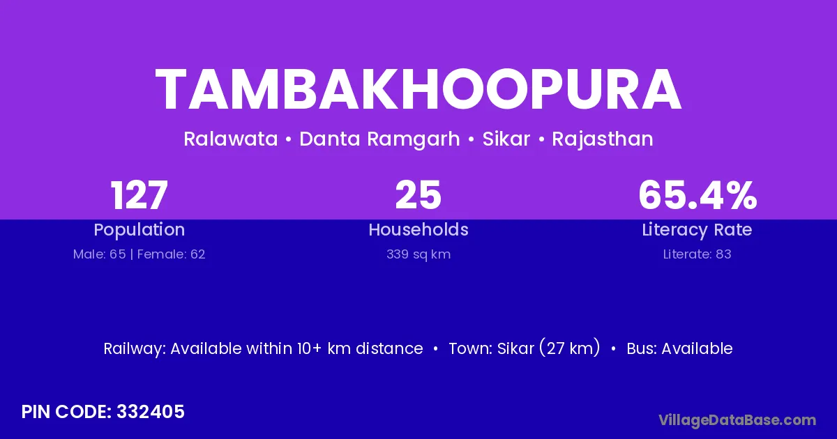 Sikar (27 km) is the nearest town to Tambakhoopura village for major economic activities and is located approximately 27 km away.