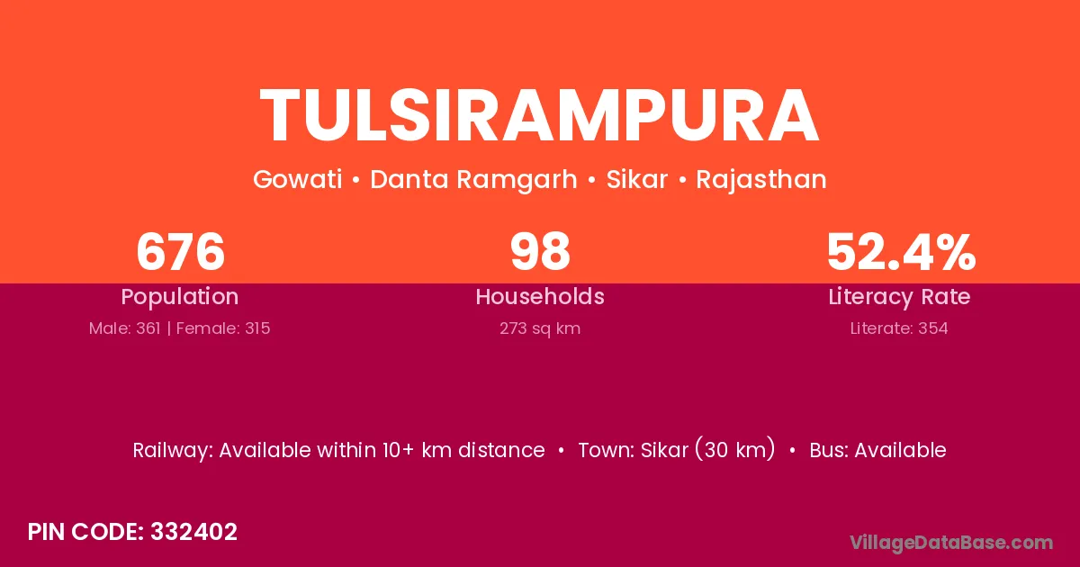 Sikar (30 km) is the nearest town to Tulsirampura village for major economic activities and is located approximately 30 km away.