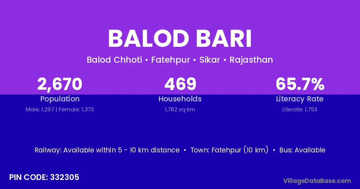Fatehpur (10 km) is the nearest town to Balod Bari village for major economic activities and is located approximately 10 km away.