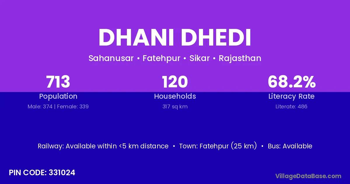 Dhani Dhedi village has a total population of 713 people, of which 374 are males and 339 are females.