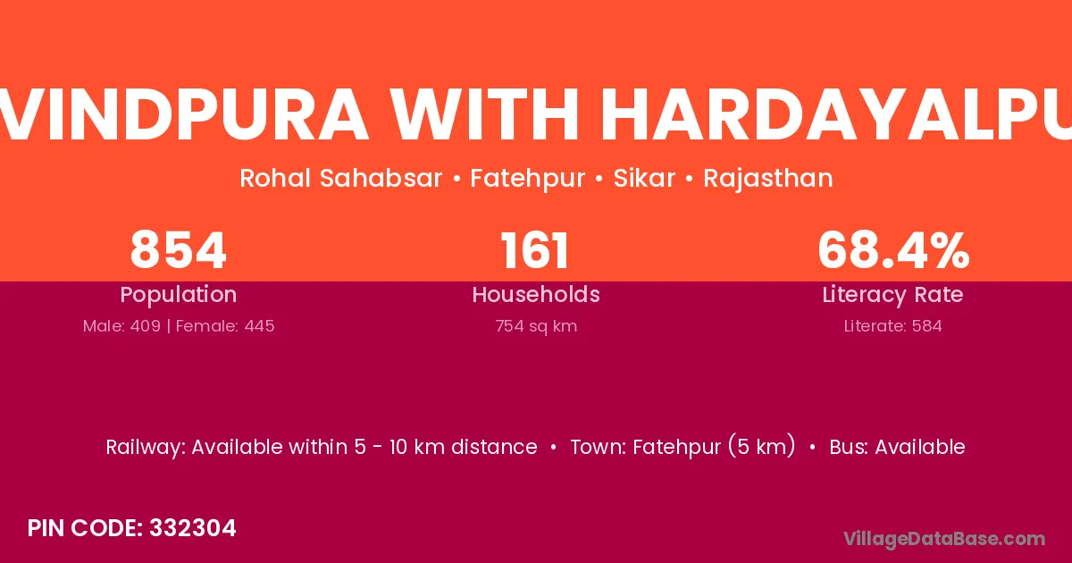 Govindpura With Hardayalpura village has a total population of 854 people, of which 409 are males and 445 are females.