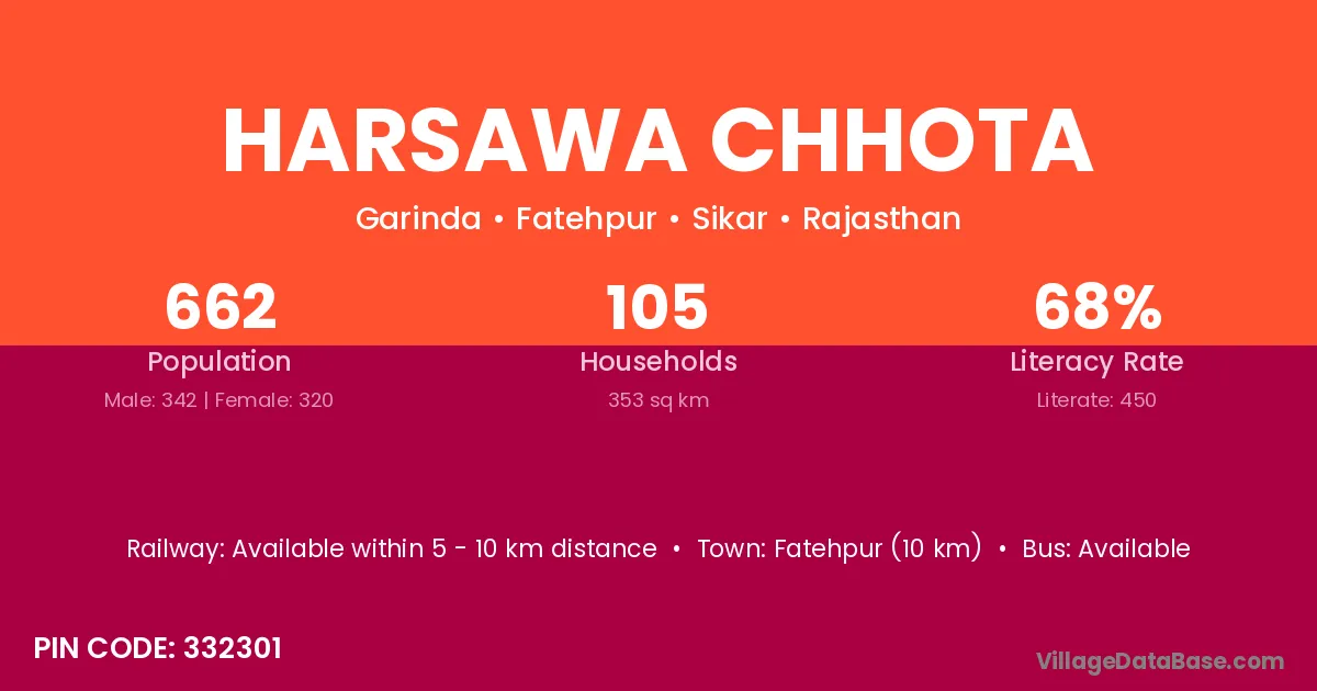 Harsawa Chhota village has a total population of 662 people, of which 342 are males and 320 are females.