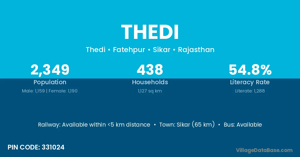 Sikar (65 km) is the nearest town to Thedi village for major economic activities and is located approximately 65 km away.