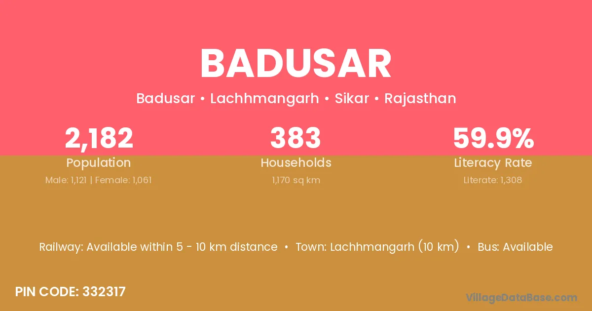 Lachhmangarh (10 km) is the nearest town to Badusar village for major economic activities and is located approximately 10 km away.