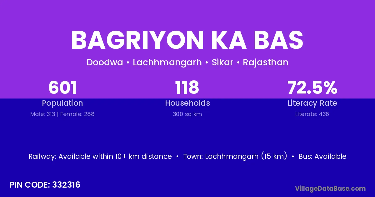 Bagriyon Ka Bas village has a total population of 601 people, of which 313 are males and 288 are females.