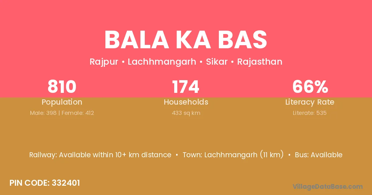 Bala Ka Bas village has a total population of 810 people, of which 398 are males and 412 are females.