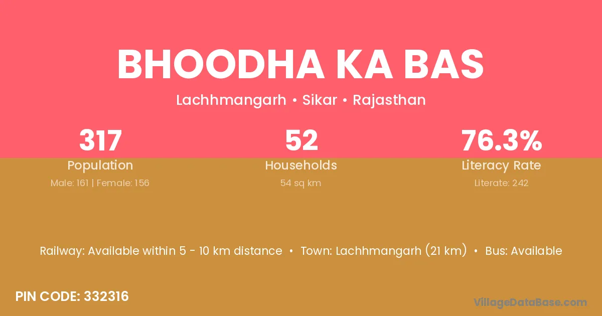 Bhoodha Ka Bas village has a total population of 317 people, of which 161 are males and 156 are females.