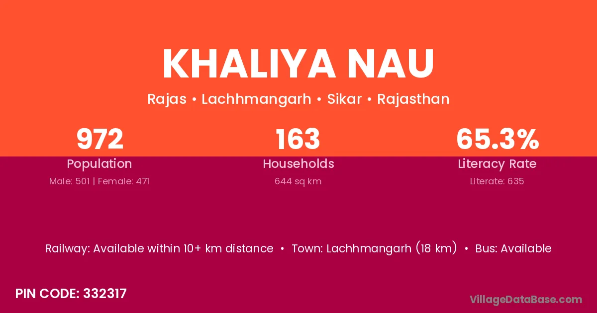 Lachhmangarh (18 km) is the nearest town to Khaliya Nau village for major economic activities and is located approximately 18 km away.