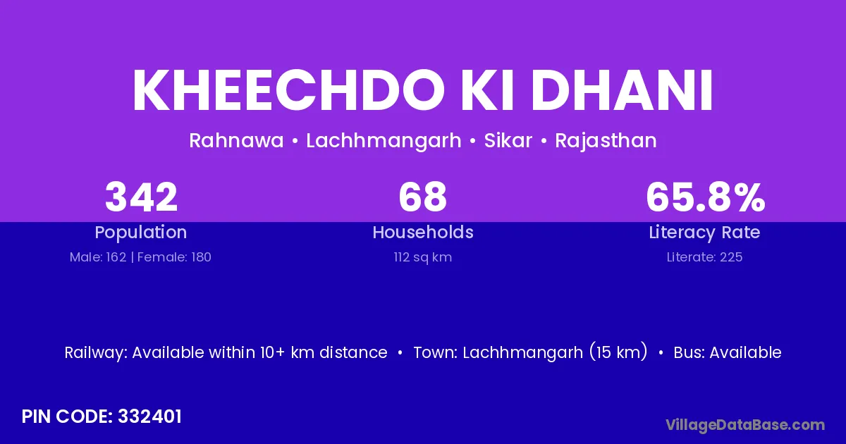 Kheechdo Ki Dhani village has a total population of 342 people, of which 162 are males and 180 are females.