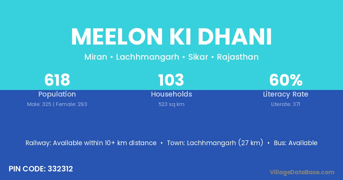 Lachhmangarh (27 km) is the nearest town to Meelon Ki Dhani village for major economic activities and is located approximately 27 km away.