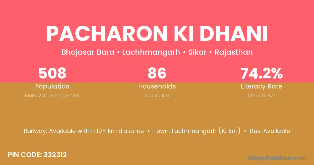 Pacharon Ki Dhani village has a total population of 508 people, of which 270 are males and 238 are females.