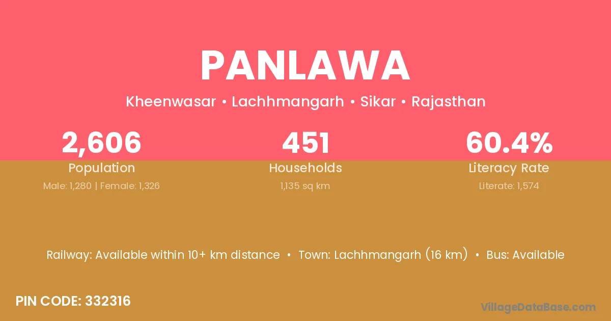 Lachhmangarh (16 km) is the nearest town to Panlawa village for major economic activities and is located approximately 16 km away.