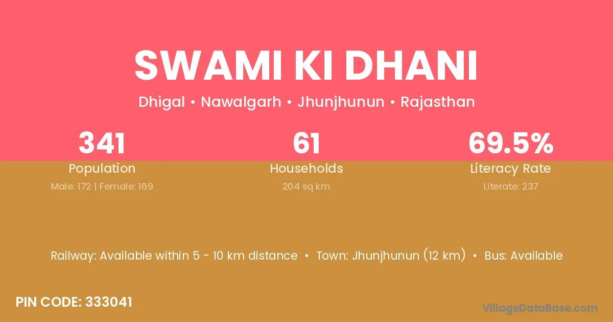 The literacy rate of Swami Ki Dhani village is 67.90%. Male literacy stands at 79.27% and female literacy at 55.20%.