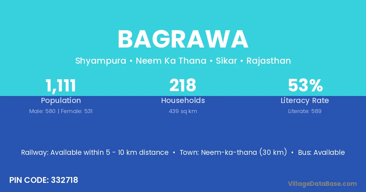 Neem-ka-thana (30 km) is the nearest town to Bagrawa village for major economic activities and is located approximately 30 km away.