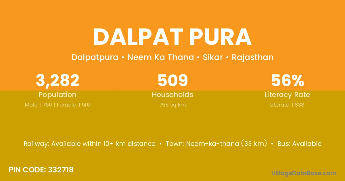 Neem-ka-thana (33 km) is the nearest town to Dalpat Pura village for major economic activities and is located approximately 33 km away.