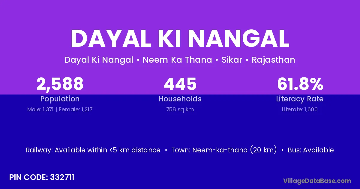 Neem-ka-thana (20 km) is the nearest town to Dayal Ki Nangal village for major economic activities and is located approximately 20 km away.