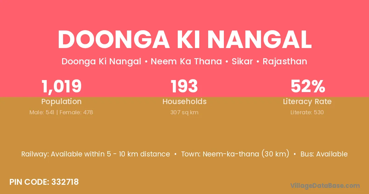 Neem-ka-thana (30 km) is the nearest town to Doonga Ki Nangal village for major economic activities and is located approximately 30 km away.