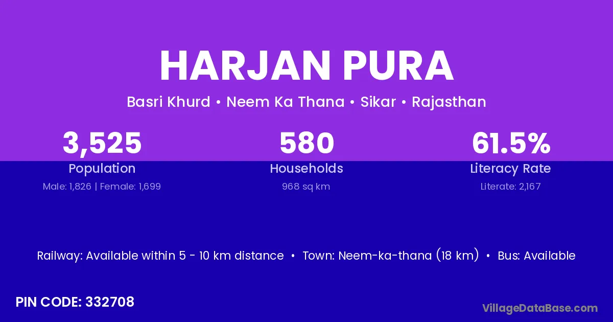 Neem-ka-thana (18 km) is the nearest town to Harjan Pura village for major economic activities and is located approximately 18 km away.
