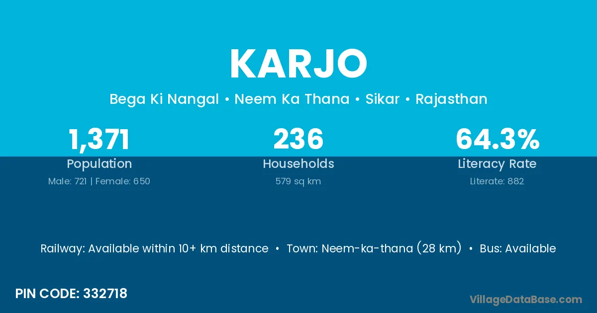 Neem-ka-thana (28 km) is the nearest town to Karjo village for major economic activities and is located approximately 28 km away.