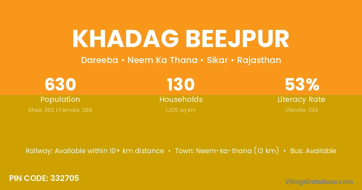 Neem-ka-thana (13 km) is the nearest town to Khadag Beejpur village for major economic activities and is located approximately 13 km away.