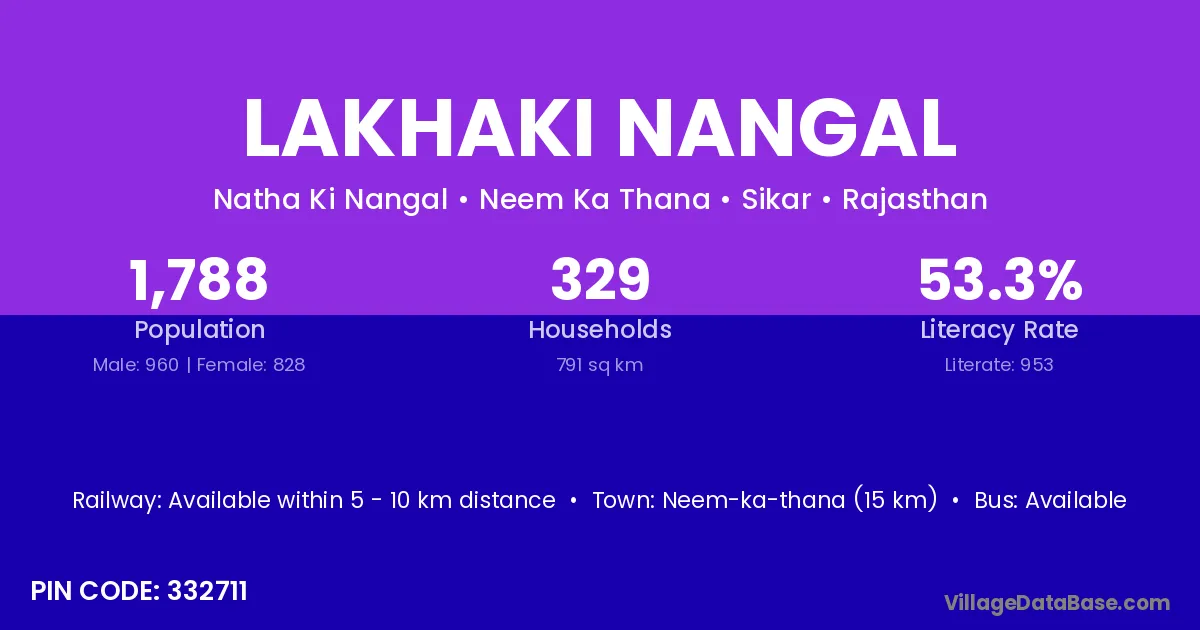 Neem-ka-thana (15 km) is the nearest town to Lakhaki Nangal village for major economic activities and is located approximately 15 km away.