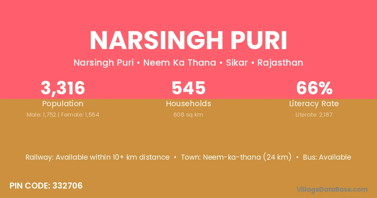 Neem-ka-thana (24 km) is the nearest town to Narsingh Puri village for major economic activities and is located approximately 24 km away.