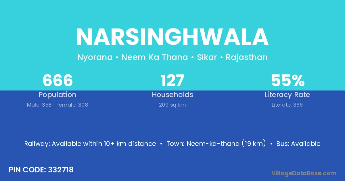 Neem-ka-thana (19 km) is the nearest town to Narsinghwala village for major economic activities and is located approximately 19 km away.