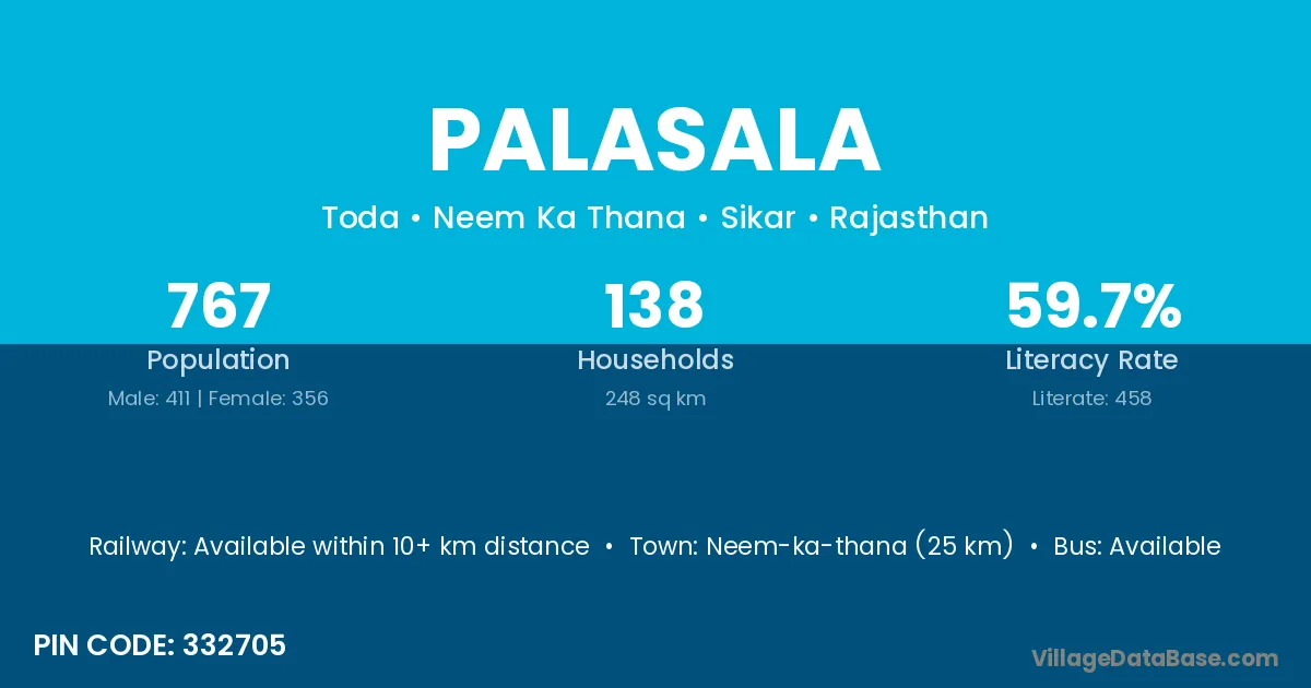 Neem-ka-thana (25 km) is the nearest town to Palasala village for major economic activities and is located approximately 25 km away.