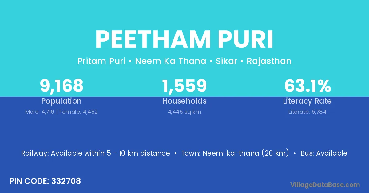 Neem-ka-thana (20 km) is the nearest town to Peetham Puri village for major economic activities and is located approximately 20 km away.