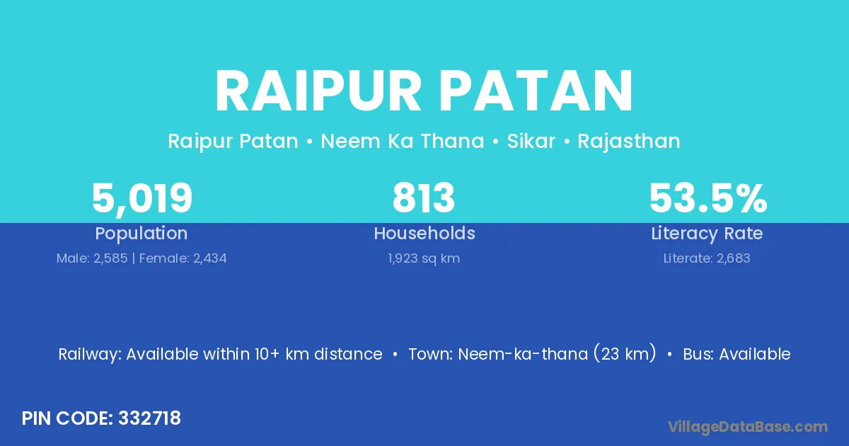 Neem-ka-thana (23 km) is the nearest town to Raipur Patan village for major economic activities and is located approximately 23 km away.