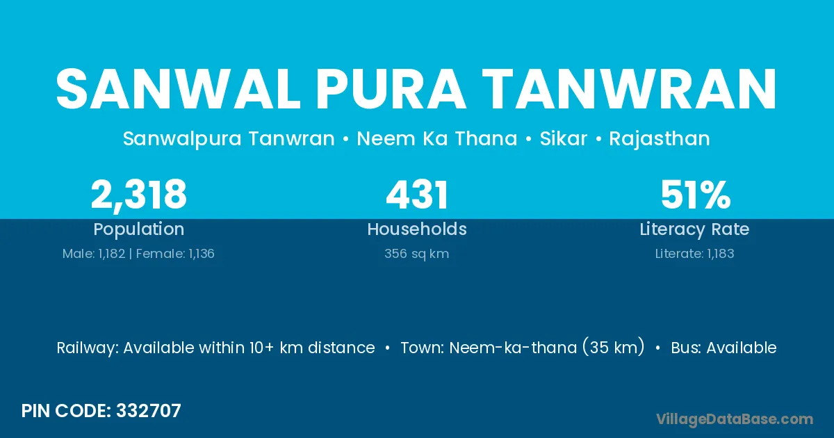 Neem-ka-thana (35 km) is the nearest town to Sanwal Pura Tanwran village for major economic activities and is located approximately 35 km away.