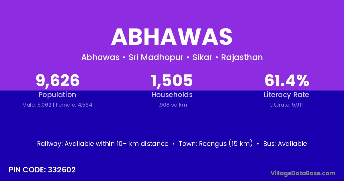 Reengus (15 km) is the nearest town to Abhawas village for major economic activities and is located approximately 15 km away.