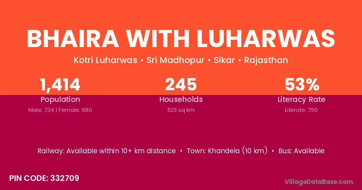 Khandela (10 km) is the nearest town to Bhaira With Luharwas village for major economic activities and is located approximately 10 km away.