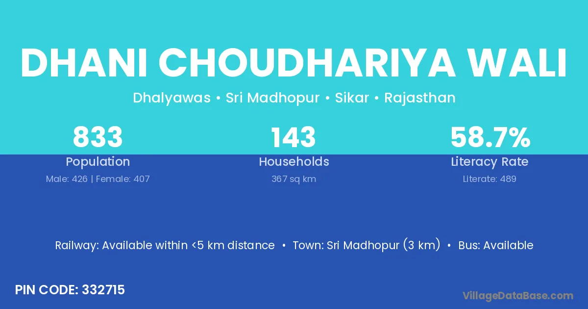 Sri Madhopur (3 km) is the nearest town to Dhani Choudhariya Wali village for major economic activities and is located approximately 3 km away.