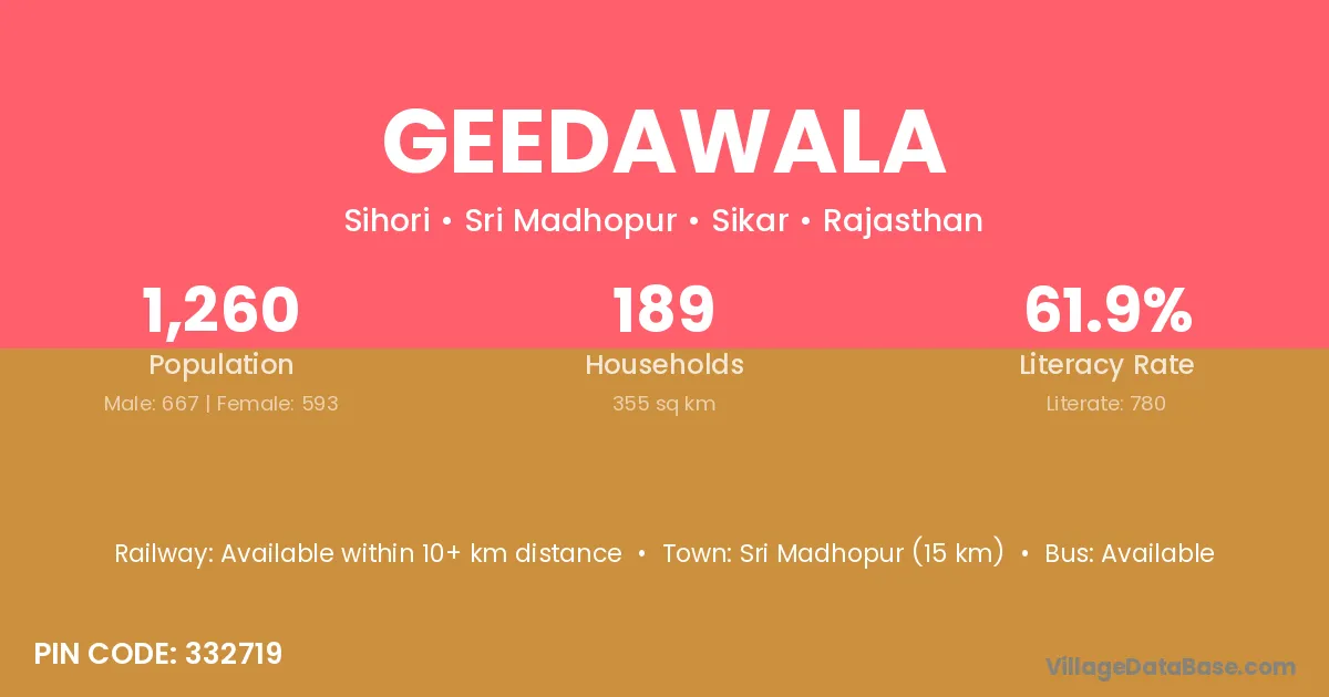 Sri Madhopur (15 km) is the nearest town to Geedawala village for major economic activities and is located approximately 15 km away.