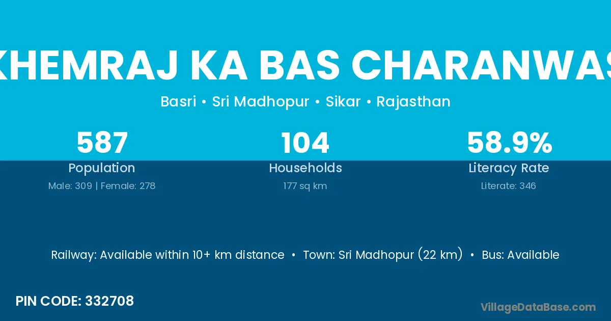 Sri Madhopur (22 km) is the nearest town to Khemraj Ka Bas Charanwas village for major economic activities and is located approximately 22 km away.