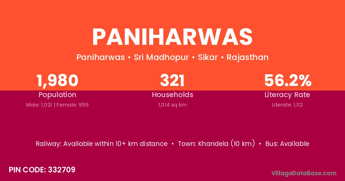 Khandela (10 km) is the nearest town to Paniharwas village for major economic activities and is located approximately 10 km away.