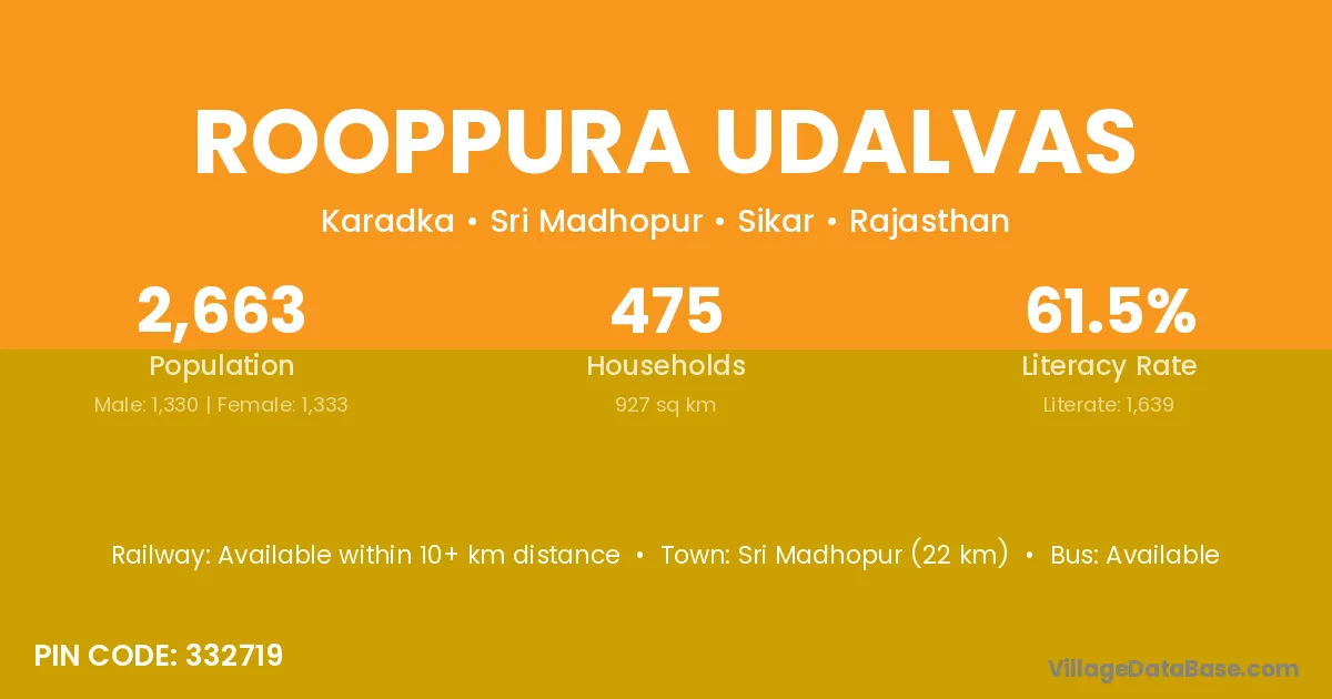 Sri Madhopur (22 km) is the nearest town to Rooppura Udalvas village for major economic activities and is located approximately 22 km away.