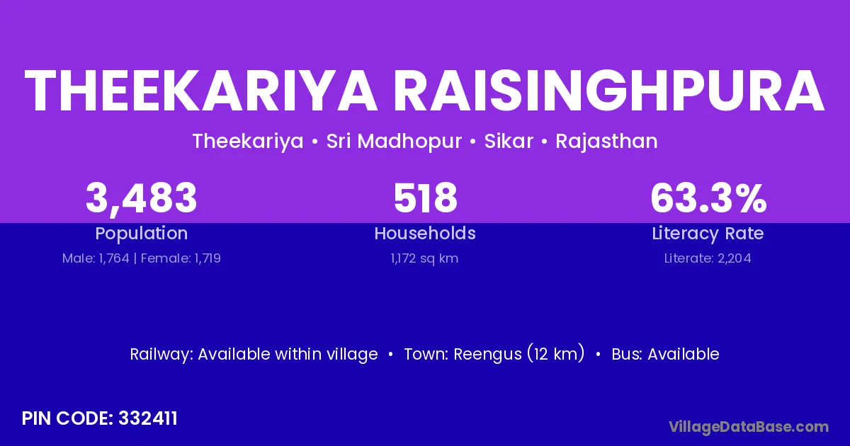 Reengus (12 km) is the nearest town to Theekariya Raisinghpura village for major economic activities and is located approximately 12 km away.