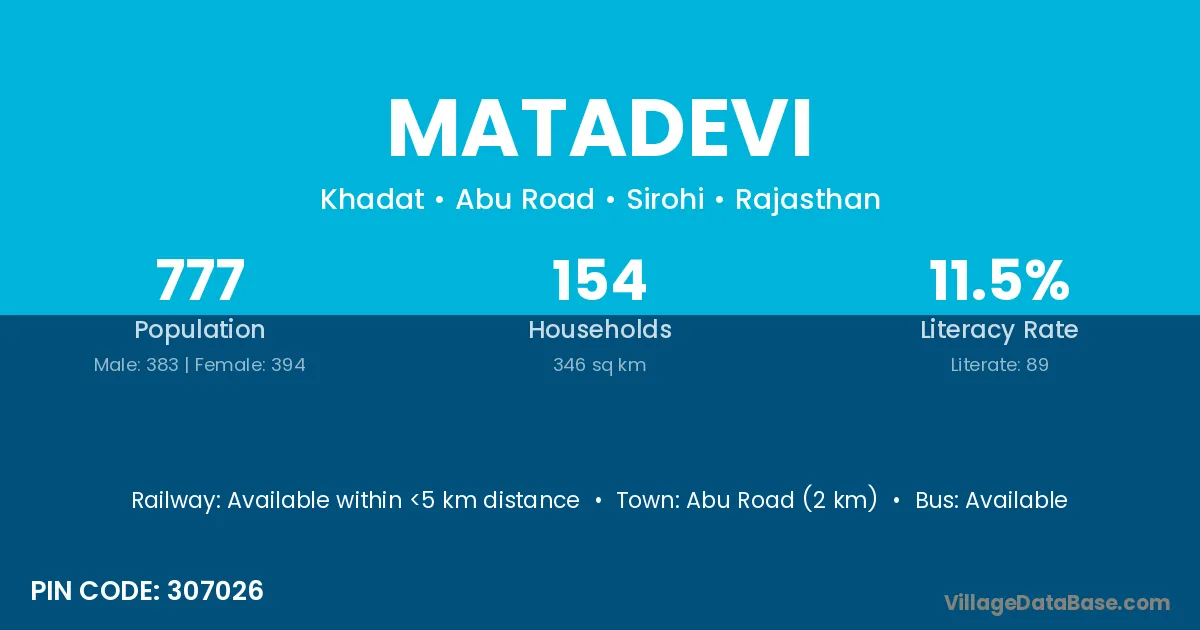 Abu Road (2 km) is the nearest town to Matadevi village for major economic activities and is located approximately 2 km away.