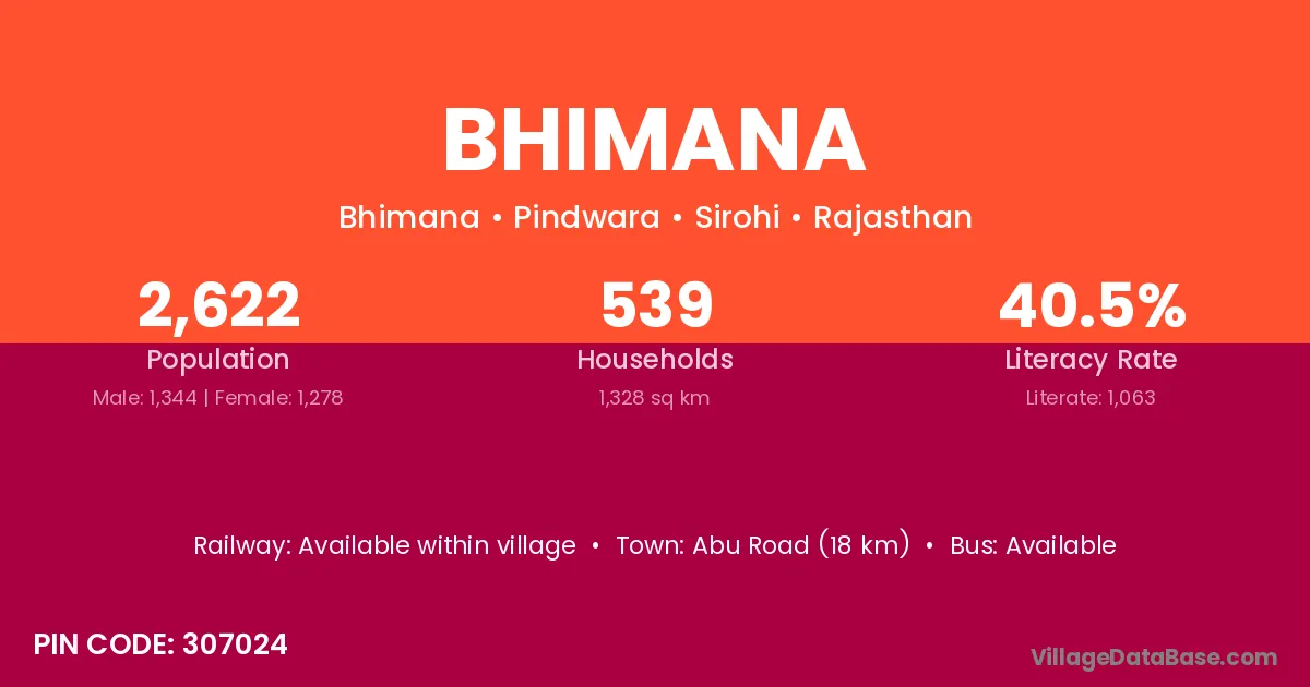 Abu Road (18 km) is the nearest town to Bhimana village for major economic activities and is located approximately 18 km away.