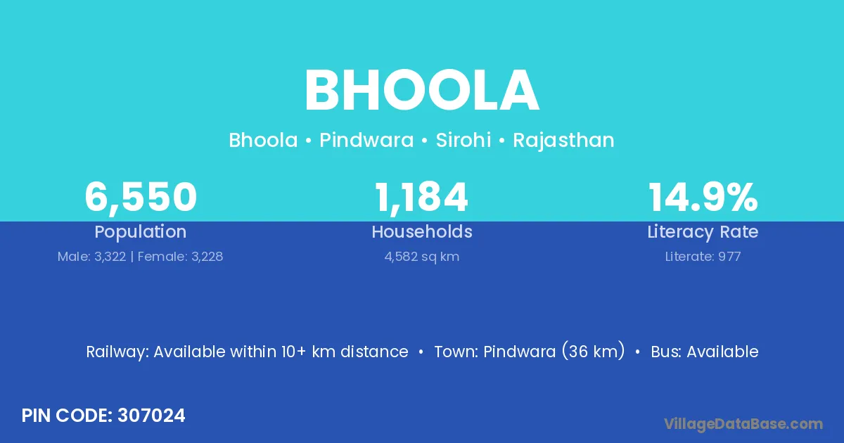 Pindwara (36 km) is the nearest town to Bhoola village for major economic activities and is located approximately 36 km away.