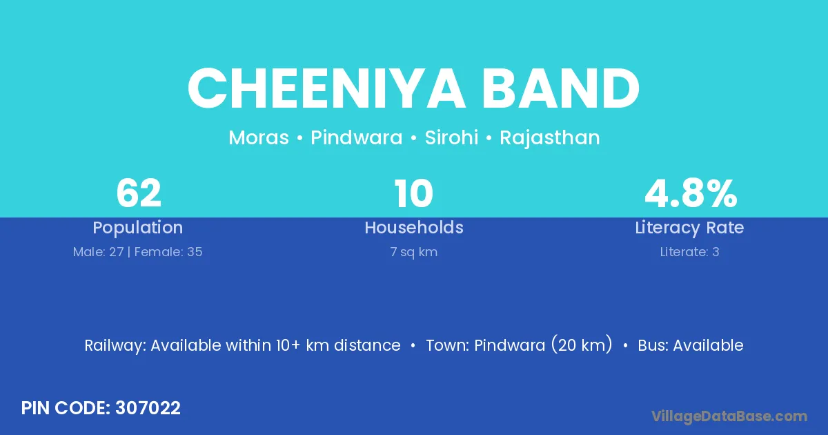Pindwara (20 km) is the nearest town to Cheeniya Band village for major economic activities and is located approximately 20 km away.