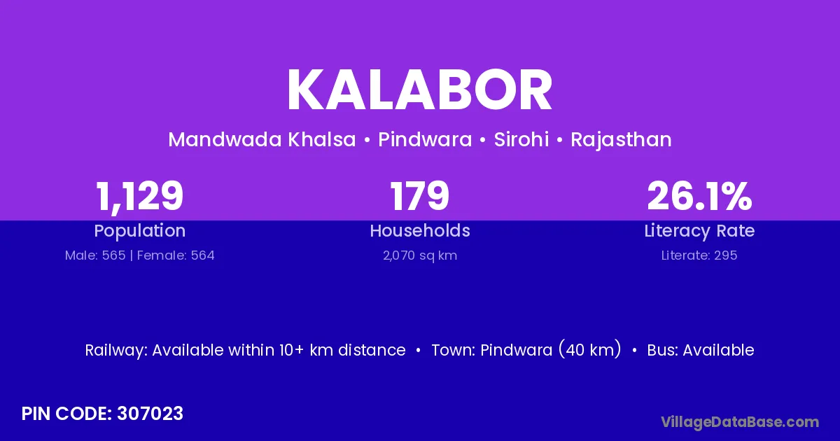 Pindwara (40 km) is the nearest town to Kalabor village for major economic activities and is located approximately 40 km away.