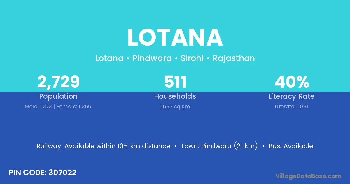 Pindwara (21 km) is the nearest town to Lotana village for major economic activities and is located approximately 21 km away.