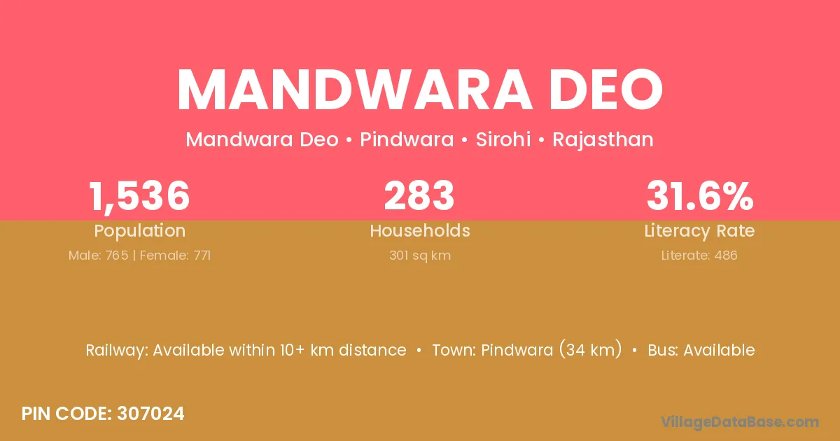 Pindwara (34 km) is the nearest town to Mandwara Deo village for major economic activities and is located approximately 34 km away.