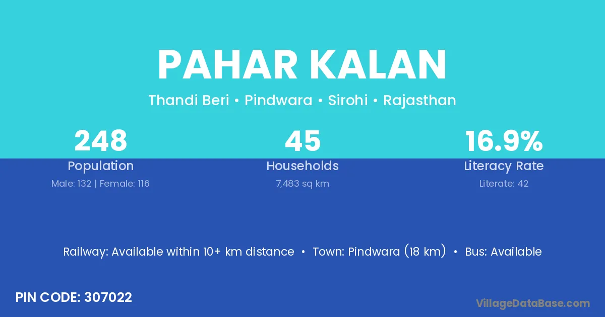 Pindwara (18 km) is the nearest town to Pahar Kalan village for major economic activities and is located approximately 18 km away.