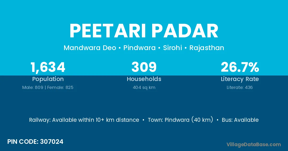 Pindwara (40 km) is the nearest town to Peetari Padar village for major economic activities and is located approximately 40 km away.